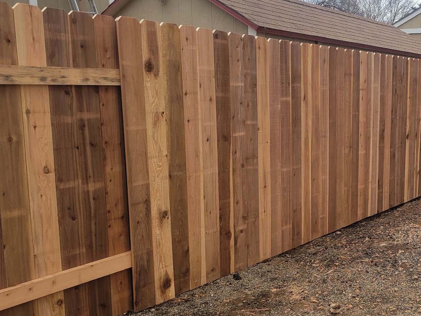 Stockade style fencing consists of tightly spaced vertical wood boards that are installed without gaps between them offering excellent privacy and security by creating a solid barrier for Mountain Home area homes.